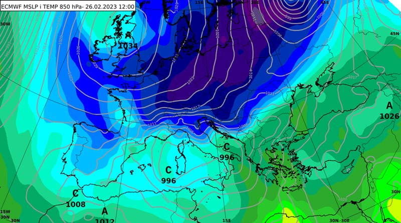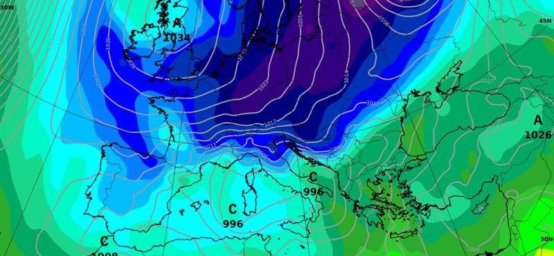 Sa slabljenjem anticiklone i pritjecanjem vlažnog zraka sa zapada već u četvrtak i petak će posvuda biti oblačnije i mjestimice kiše, a tijekom vikenda s prodorom hladnog zraka sa sjevera doći će do produbljivanja ciklone u Sredozemlju (Slika 1.) i intenzivnijih meteoroloških procesa.