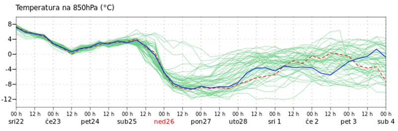 Očekivani nagli prodor hladnog zraka bit će vrlo snažan – temperatura na izobarnoj plohi 850 hPa past će i više od 12 °C (na oko -8 °C) u nešto više od jednog dana (Slika 2.). Posljedice prolaska hladne fronte i jačanja ciklone bit će mjestimice obilnija kiša koja će u nedjelju u unutrašnjosti prijeći u snijeg. Nakon jakog juga i jugozapadnjaka zapuhat će sjeveroistočni vjetar, a na Jadranu žestoka bura.