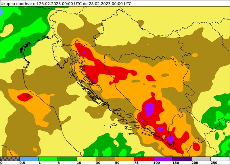 Najviše oborine predviđa se od subote do ponedjeljka (Slika 3.), nerijetko bi moglo pasti više od 50 mm. Uz jako zahladnjenje u unutrašnjosti će značajni dio te oborine biti u obliku snijega, a u gorju se upozorava na obilniji snijeg, osobito u nedjelju kad može pasti i više od 30 cm.