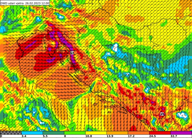 Napominjemo da su susnježica i snijeg mogući i na obali, ponajprije sjevernog Jadrana i sjevernog dijela srednjeg Jadrana gdje će sa subote na nedjelju zapuhati jaka i olujna bura, podno Velebita s orkanskim udarima, moguće i preko 150 km/h (Slika 4.). Na južnom Jadranu će u nedjelju vjerojatno biti olujnog juga.