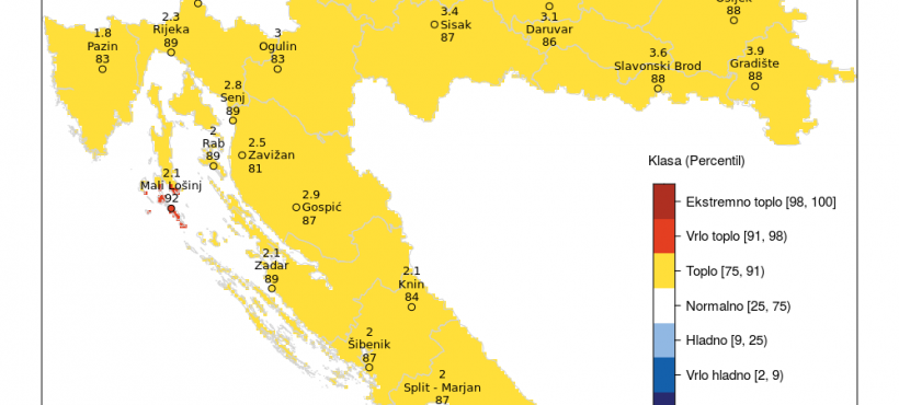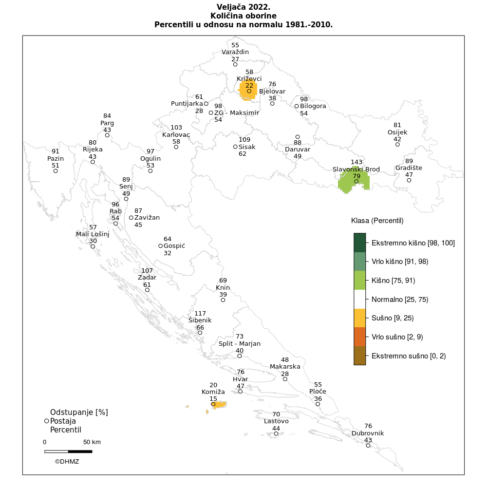 Oborinske prilike u Hrvatskoj u veljači 2022. godine izražene percentilima detaljnije su opisane sljedećim kategorijama: sušno (okolica Križevaca, otok Vis), normalno (gotovo čitava Hrvatska) i kišno (šira okolica Slavonskog Broda), objavio je DHMZ.