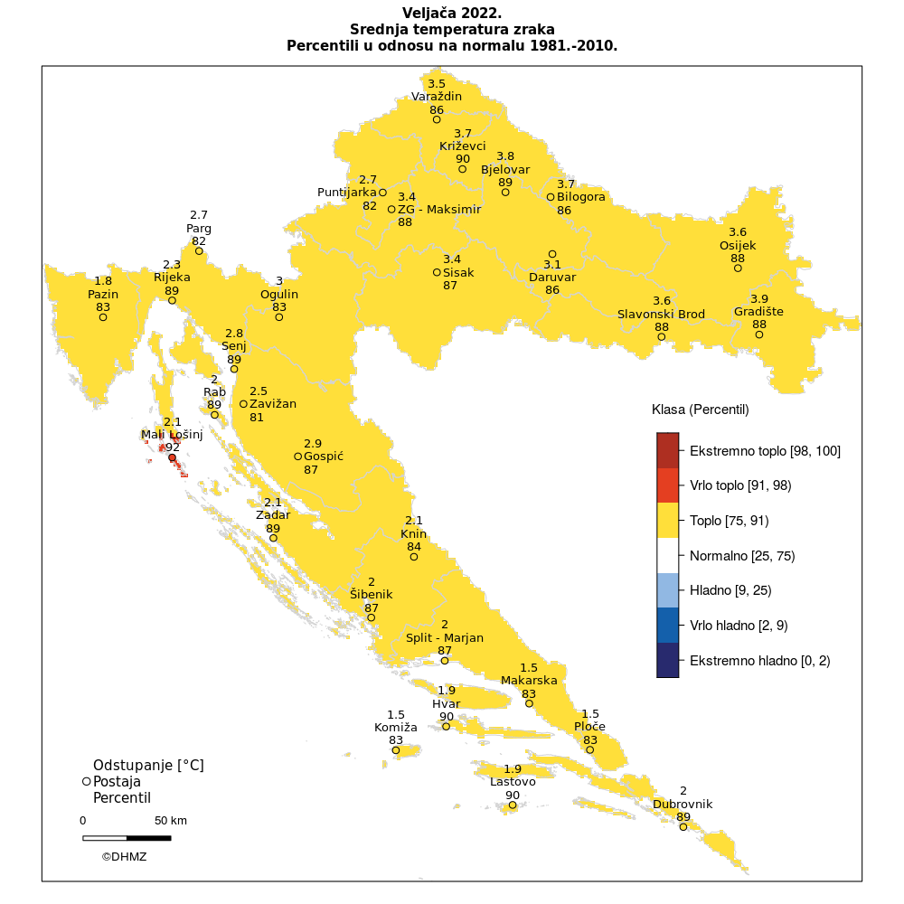 Prema raspodjeli percentila, temperaturne prilike u Hrvatskoj za veljaču 2022. godine opisane su sljedećim kategorijama: toplo (čitava Hrvatska izuzev Lošinja i juga Cresa) i vrlo toplo (Lošinj i jug Cresa).