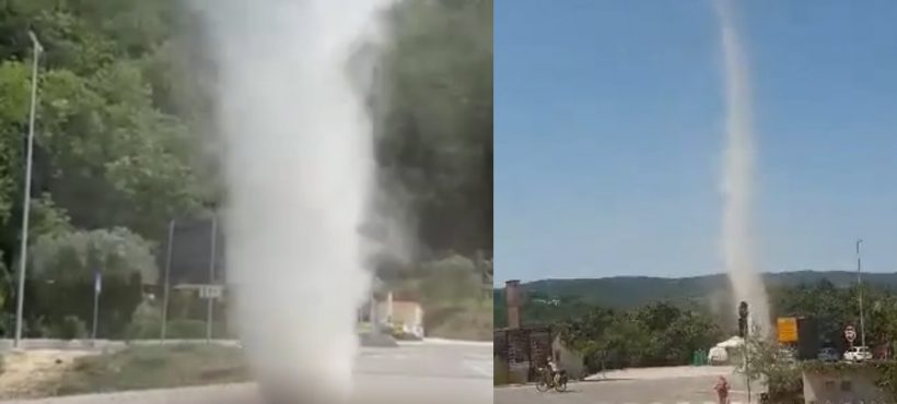 Fascinantan dust devil, odnosno prašinski vrtlog danas se javio podno Motovuna. Najčešće je riječ o bezopasnoj pojavi, iako u svom jačem obliku može uzrokovati manju materijalnu štetu kao što je trganje suncobrana i slično, što smo već zabilježili u Istri nekoliko puta.