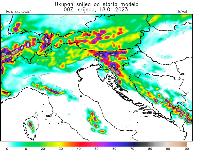 Ukupna količina oborina u obliku snijega u višem gorju mogla bi prijeći 100 mm do sredine tjedna, međutim zbog graničnih temperatura zraka, česte izmjene vjetrova i temperatura, ukupna količina snijega na tlu bit će vrlo raznolika.