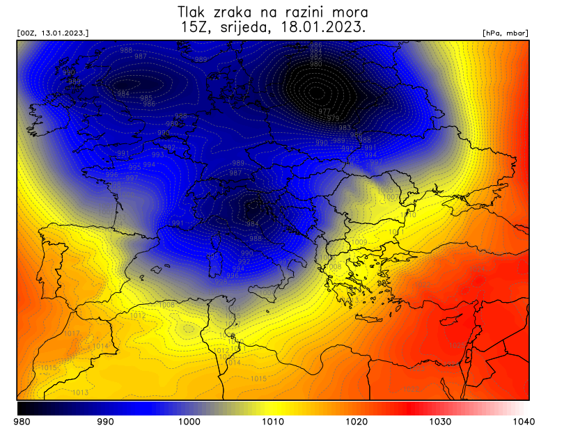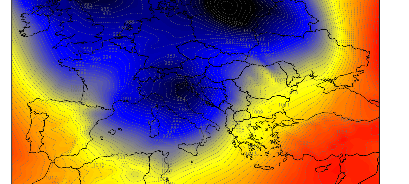 Nakon dominacije crvene boje na meteorološkim kartama, odnosno visokog tlaka zraka, naš dio Europe “progutati” će gigantske ciklone u čijem će se središtu tlak nerijetko snižavati ispod 985 hPa, što se dobro može uočiti na priloženoj karti. Centar nekoliko sekundarnih ciklona vjerojatno će se razviti na sjevernom dijelu Jadrana.