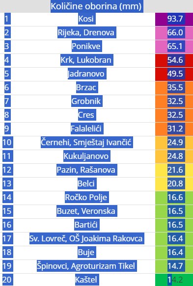 Najviše kiše palo je na riječkom području i na Krku. Meteorološka postaja u Kosima u zaleđu Rijeke tako je zabilježila 93 mm, dok postaja Ponikve u središnjem dijelu Krka mjeri 65 mm.