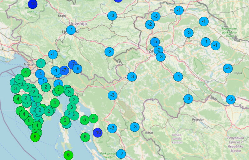 Od nizina unutrašnjosti Hrvatske, najhladnije je bilo u Daruvaru gdje je izmjereno čak -4,5 °C. U Karlovcu je bilo -3,2 °C, Varaždinu -2,2 °C, Zagrebu -2 °C…