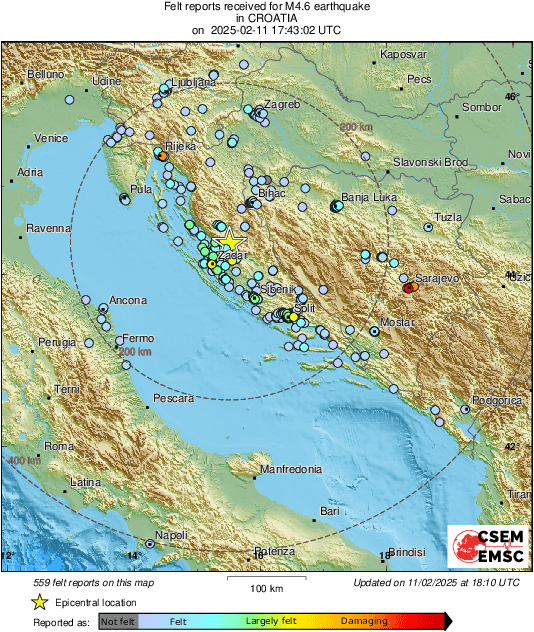 Večeras, 11. veljače 2025., u 18:43 seizmografi Seizmološke službe RH zabilježili su jak potres magnitude 4.8 prema Richteru.