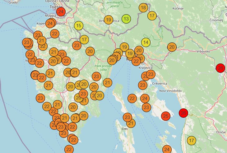 Uz kišu, bilježe se i visoke temperature. Trenutno (petak 12:20) na većini postaja sjevernog Jadrana mjeri se preko 20 °C, puše umjeren i jak južni vjetar s olujnim udarima zbog čega je pomorski promet u prekidu na liniji Valbiska-Lopar, kao i sve katamaranske linije iz Pule i Rijeke.