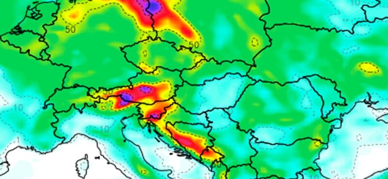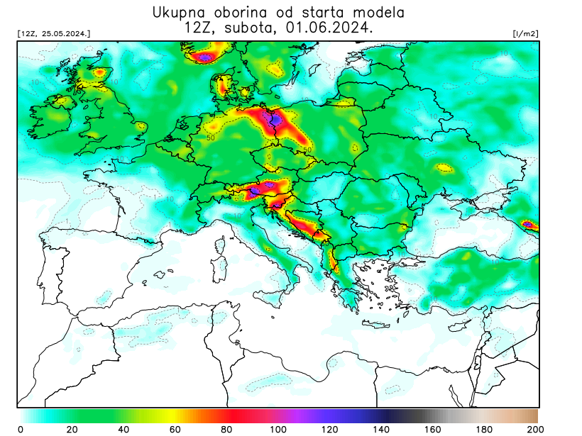 Suma oborina u idućih 7 dana izgleda dojmljivo u cijeloj središnjoj Europi i našem dijelu Balkana, te su mnogi krajevi obojani intenzivnijim bojama, što ukazuje na mogućnost akumulacije većih količina kiše. Obilna kiša u kraćem vremenskom razdoblju mogla bi lokalno uzrokovati bujične poplave.
