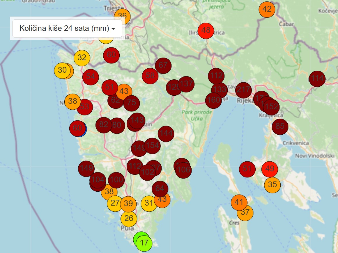 Ekstremna kiša danas je pala u gotovo cijeloj Istri i na Kvarneru. Na riječkom području zabilježeno je lokalno više od 200 mm, dok je na Rovinjštini palo do 160 mm, međutim iznimno obilne količine zabilježene su posvuda izuzev krajnjeg juga poluotoka gdje je izmjereno do 20 mm.