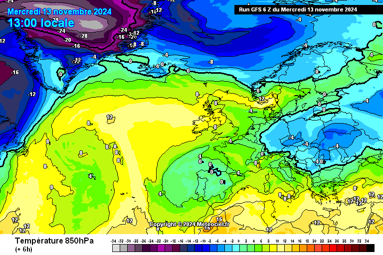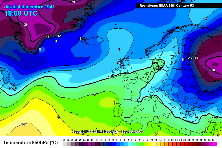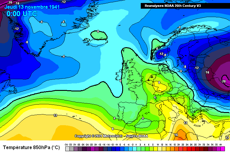 Za razliku od studenoga 1941., današnji vremenski obrasci pokazuju osjetan deficit hladnijeg zraka na cijeloj Sjevernoj hemisferi. Studeni prolazi s blagim temperaturama, a ovakve ekstremne temperature postaju rijetkost. Pogledajmo današnje temperature zraka na 850 hPa u Europi te ih usporedite s gornje dvije karte.