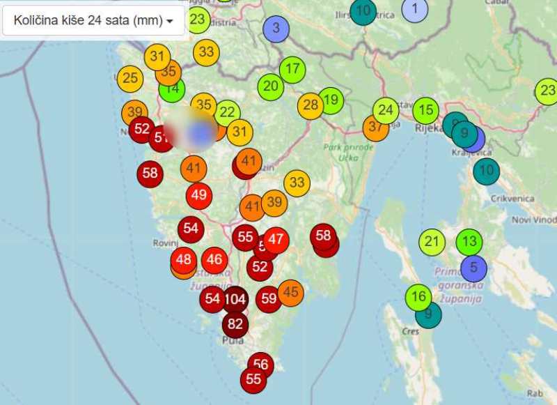 Najviše kiše palo je u Puli i Vodnjanu, od 80 do 110 mm, dok je na ostatku područja zabilježeno većinom između 30 i 50 mm. Na Kvarneru je palo značajno manje kiše, na većem dijelu područja od 15 do 25 mm.
