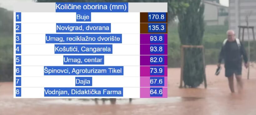Najviše kiše palo je u Bujama, čak 171 mm. Zatim slijedi Novigrad sa 135 mm, Umag s 94 mm, a iznimne količine oborina pale su i drugdje na istarskom poluotoku. Čak je i na potezu od Vodnjana do Draguzeti na Barbanštini palo između 50 i 70 mm, dok je u Buzetu izmjereno 55 mm.