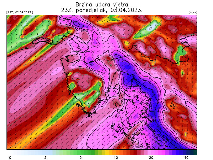 Bura će naročito jaka biti u ponedjeljak kada će imati olujne, a na Kvarneru i orkanske udare zbog čega je na snazi crveni stupanj upozorenja Meteoalarma. Bura podno Velebita može dostizati udare od čak 200 km/h, što je za travanj zaista neuobičajeno.