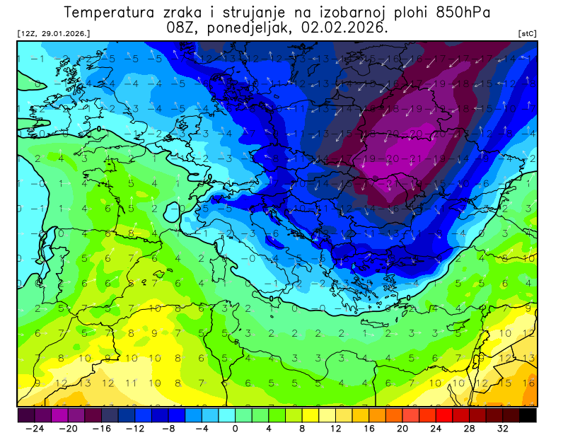 U takvoj situaciji nakon 4 stabilnija i hladnija dana, u drugom dijelu tjedna očekuje nas pogoršanje vremena s jugom i kišom, dok će ponegdje biti i obilnijih oborina. Temperature zraka porasti će osjetno iznad uobičajenih vrijednosti za početak veljače.