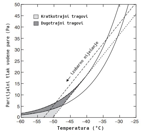 Međutim, sad je pitanje u kakvom se je okruženju našla takva kondenzirana/kristalizirana vodena para. Temperatura okoline je svakako vrlo niska na standardnoj visini leta, ali što je s drugim uvjetima – u prvom redu vodenom parom okoline, ili preciznije, relativnom vlažnošću? Postoje 2 generalna scenarija: