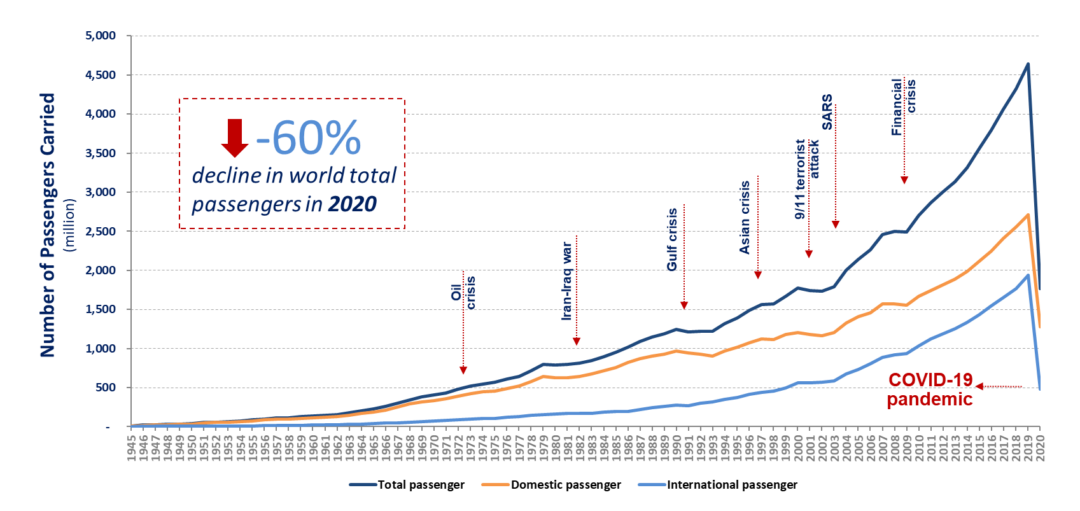 Uz kratkotrajan prekid u doba covid-mjera, contraila na nebu ima iz godine u godinu sve više. Razlog tome je većinom u gotovo eksponencijalnom rastu broja letova koji se događa od 1990-tih godina na ovamo, kao što je vidljivo iz slike ispod. Primjerice sad na prijelazu 2023. u 2024. smo na razini od blizu 5 milijardi prevezenih putnika godišnje zrakom, globalno. 30 godina ranije to je bilo svega 1.2 milijarde (četvrtina današnjeg prometa), a prije 50 godina pola milijarde (desetina današnjeg prometa).