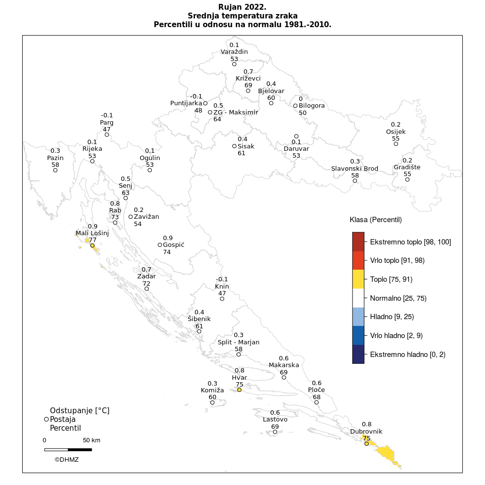 Odstupanja srednje temperature zraka u rujnu 2022. u odnosu na normalu 1981. – 2010. nalaze se u rasponu od -0,1°C (Puntijarka, Parg, Knin) do 0,9°C (Mali Lošinj, Gospić). Na većini postaja temperatura zraka je bila neznatno viša od prosječne, objavio je DHMZ.