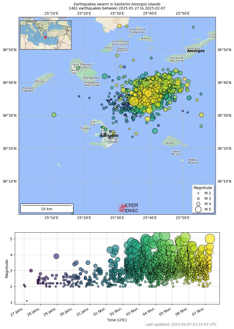 Grčki otok Santorini i okolna područja posljednjih dana bilježe izuzetno pojačanu seizmičku aktivnost. Prema podacima Euro-mediteranskog seizmološkog centra (EMSC), od 28. siječnja registrirano je više od 6000 potresa, s magnitudama do 5,1. Epicentri su locirani sjeveroistočno od Santorinija, u blizini podmorskog vulkana Kolumbo.