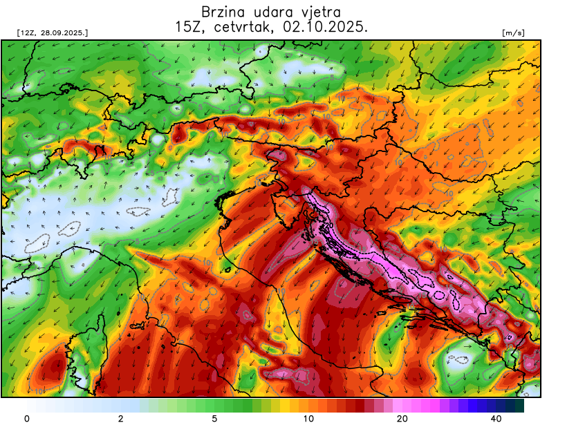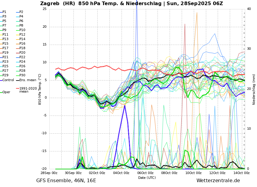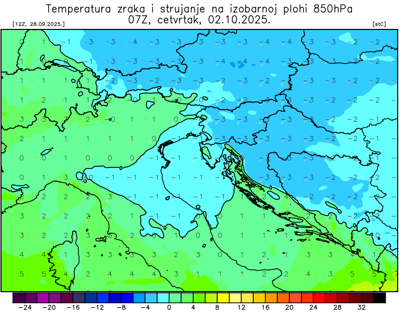 Već prvi dan listopada donosi nam drastičan pad temperature zraka, naročito u unutrašnjosti Hrvatske. Temperature zraka na 850 hPa (oko 1500 m.n.v.), snizit će se do -3 °C, što je ekstremno niska vrijednost za doba godine.