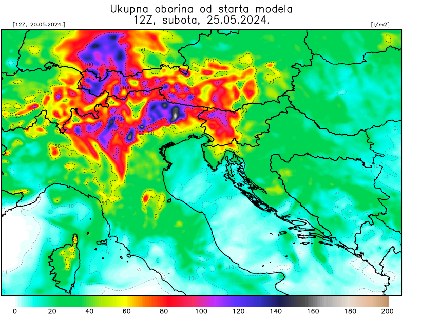 Istramet WRF je puno blaži u prognozama, međutim u ukupnoj sumi oborina u idućih 5 dana također možemo uočiti kako su u regiji itekako moguće obilne oborine. Ukupna suma oborina ponegdje bi mogla prijeći ekstremnih 200 mm.