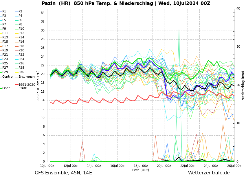 Koliko su temperature zraka iznad prosjeka možda najbolje dočarava GFS ensemble. Crvena linija predstavlja prosjek, a ostale prognozu temperature zraka na 850 hPa (oko 1500 m.n.v.). Kao što možemo uočiti, temperature zraka bit će konstantno ustaljene značajno iznad prosjeka.