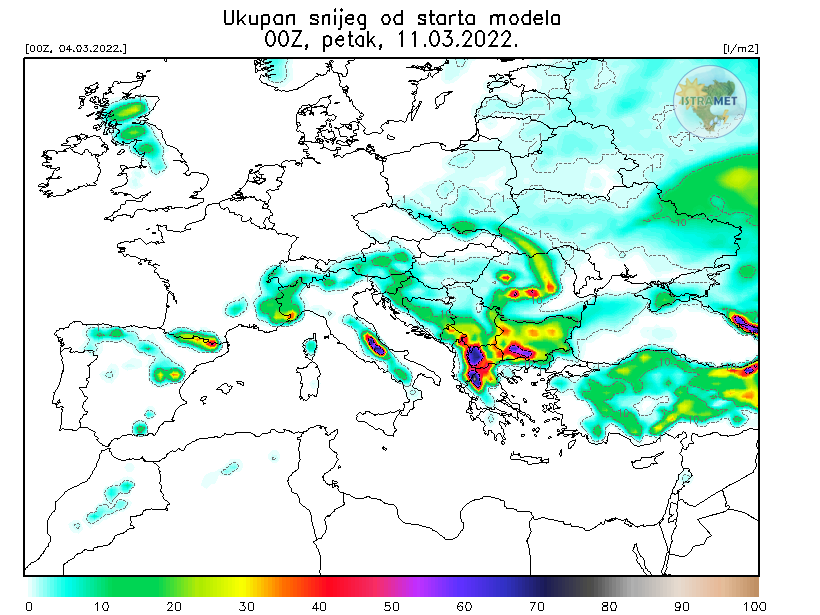 Ukupna suma oborina na istarskom području u idućih 7 dana iznosi 0 mm, međutim povremeno se mogu vidjeti tragovi oborina što može upućivati na pljuskova snijega.