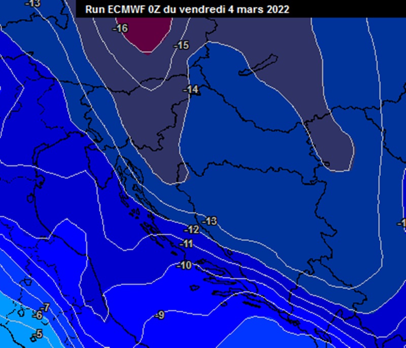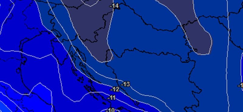 Iako će vikend biti hladan i vjetrovit, krajem idućeg tjedna prema većem dijelu modela prijeti nam još izraženije zahladnjenje uz dotok vrlo hladnog zraka polarnog porijekla. Temperature zraka na plohi od 850 hPa mogle bi se sniziti do -15 °C, što je poprilično ispod prosjeka za doba godine. To dobro možemo uočiti na priloženoj karti.
