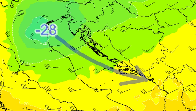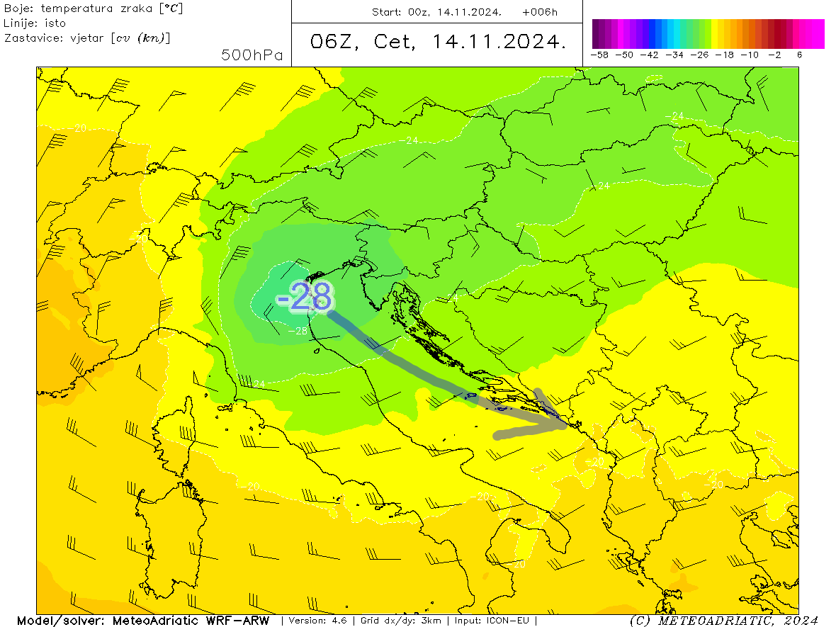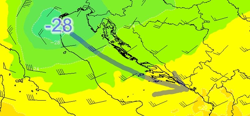 Da je riječ o visinskoj cikloni, možemo vidjeti po fascinantnim temperaturnim anomalijama na 500 hPa, što iznosi oko 5500 nadmorske visine. Jutros su u tom sloju temperature pale do -28 °C, što je oko 10 °C niže u odnosu na temperaturnu okolnog područja.