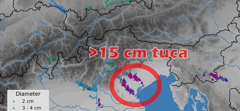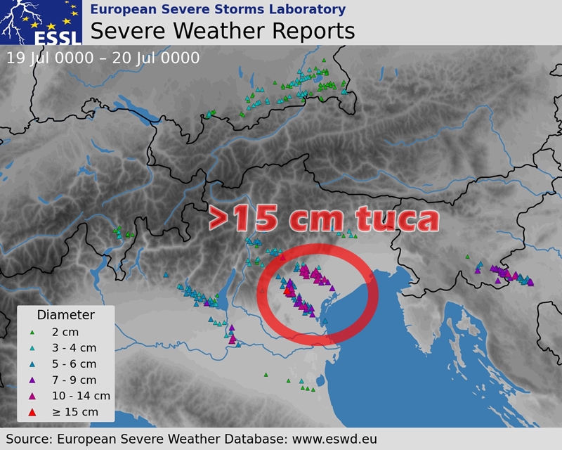 Prema podacima Europskog laboratorija za jake oluje (ESSL), u Italiji je 19.07. zabilježena tuča promjera 16 cm, što je prema njihovim informacijama novi europski rekord.