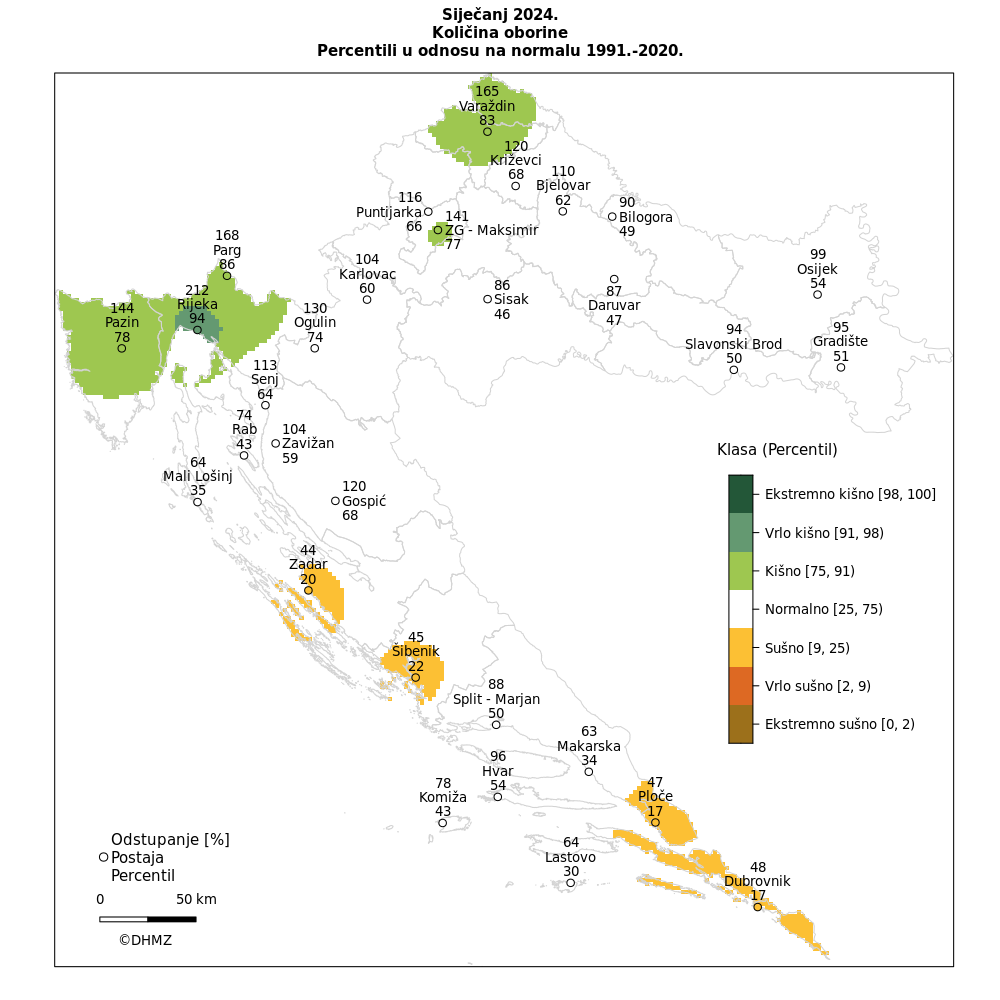 Prema raspodjeli percentila u siječnju 2024. godine su na većini postaja prevladale normalne oborinske prilike. U pojedinim dijelovima Dalmacije (Zadar, Šibenik, Ploče, Dubrovnik) su zabilježene sušne prilike. U Istri, dijelu Gorskog kotara, Varaždinu i Zagrebu bilo je kišno, a na riječkom području je siječanj bio vrlo kišan. (DHMZ).