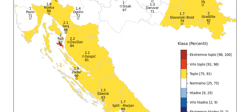 Odstupanja srednje temperature zraka u odnosu na normalu 1991. – 2020. nalaze se u rasponu od 0,6 °C (Križevci, Zagreb – Maksimir) do 2,2 °C (Zavižan). Na svim postajama temperatura zraka je bila viša od prosječne, izvijestio je DHMZ.