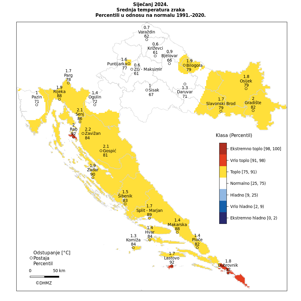 Prema raspodjeli percentila je u većini Hrvatske siječanj 2024. godine bio topao (veći dio istočne Hrvatske, Kvarner, gorska Hrvatska te sjeverna i srednja Dalmacija). U središnjoj Hrvatskoj i većem dijelu Istre je temperatura zraka bila u granicama normale dok su u južnoj Dalmaciji i na području Raba zabilježene vrlo tople prilike.